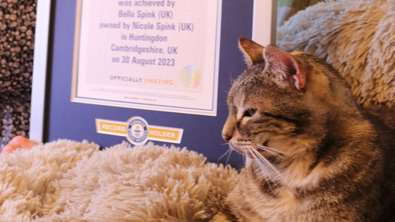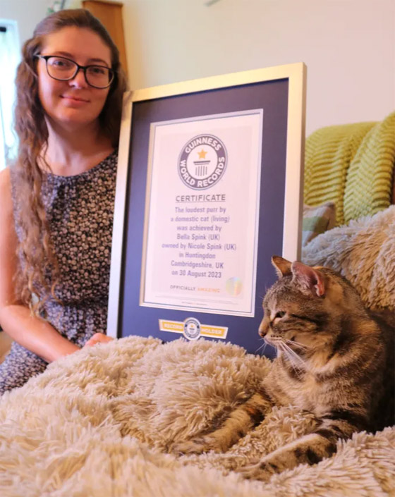 وفي حديثها عن شهادة "بيلا" الجديدة في موسوعة جينيس للأرقام القياسية، قالت سبينك: "سيكون لها مكان بارز حقًا في المنزل". وبحسب موسوعة جينيس للأرقام القياسية، فإن القطة "بيلا" تخرخر بقوة 54.6 ديسيبل، وصوتها مرتفع مثل صفير غلاية تغلي، أو غسالة أطباق، أو راديو تشغيل الموسيقى، أو ماكينة حلاقة كهربائية، أو مكتب مزدحم، أو فرشاة أسنان كهربائية، أو آلة الحلاقة.