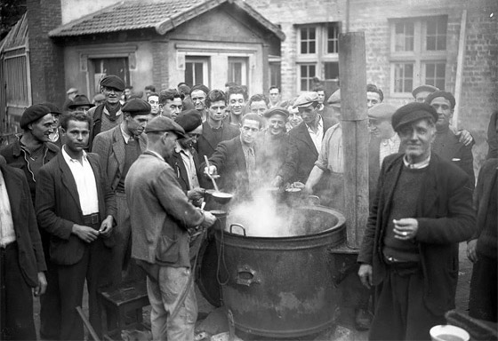 مجموعة من عمال المناجم الفرنسيين أثناء تناولهم للحساء الجماعي عام 1948