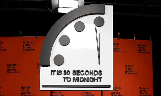 ويتخوف العالم من أنّ يحلَّ منتصفُ الليلِ بتوقيتِها، لأنّ الكوارثَ حينَها ستتوالى علينا ليس بسببِ عواملَ خارجية بل من صُنعِ يدِ البشرية. وتدق هذه الساعة منذ 77 عاماً، أيْ عندَما أنشأتها منظمة "Bulletin of the Atomic Scientists"، وتقومُ بتحديثِ الوقتِ سنويًا بناءً على المخاطرِ الكارثيةِ على الكوكبِ والبشرية.