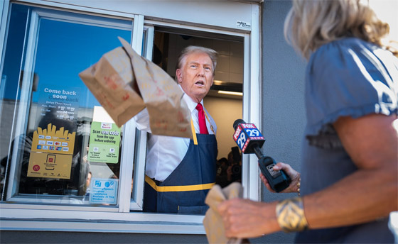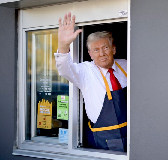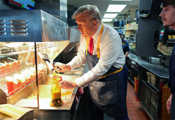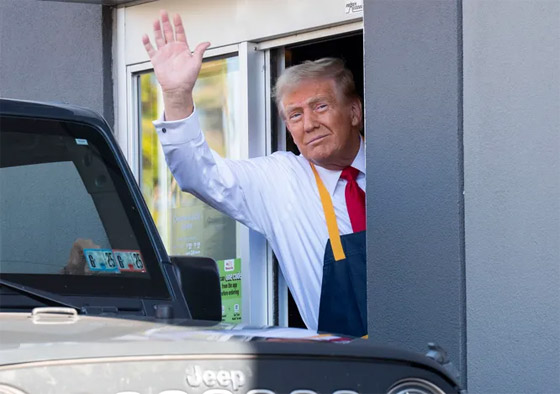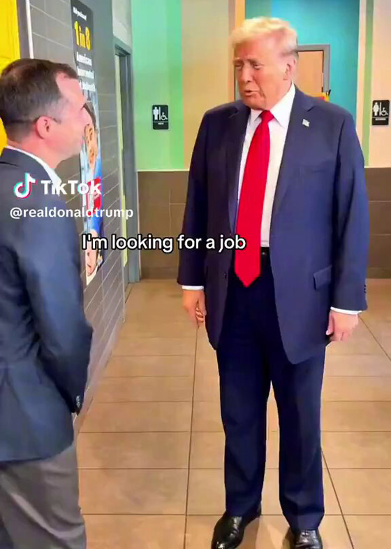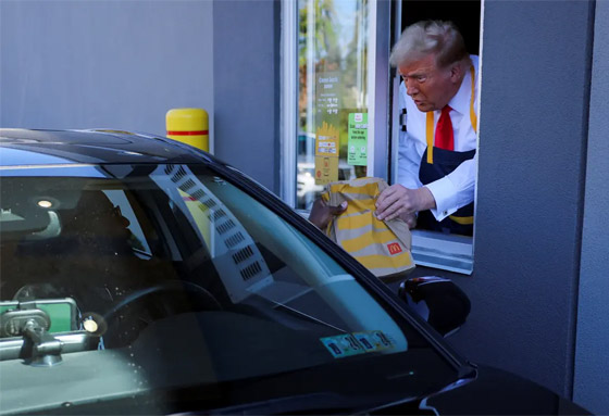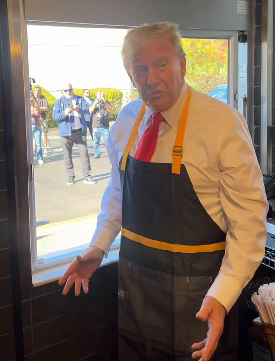 وفي وقت لاحق، قام بتسليم الطعام للعملاء من خلال نافذة الطلب في المطعم - الذي كان مغلقًا لهذا الحدث - وأخبرهم أنه صنع الطعام بنفسه وأن الأمر كله على عاتقه. وقال ترامب لمالك ماكدونالدز في فيسترفيل تريفوس: "أنا أبحث عن وظيفة"، وتابع: "وكنت أرغب دائمًا في العمل في ماكدونالدز، لكنني لم أفعل ذلك مطلقًا. أنا أتنافس ضد سيدة قالت إنها فعلت ذلك، لكن تبين أنها قصة زائفة تمامًا".