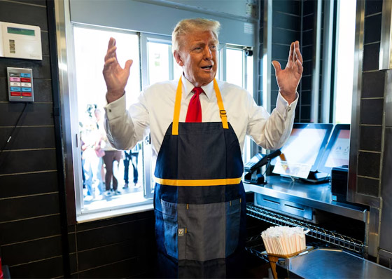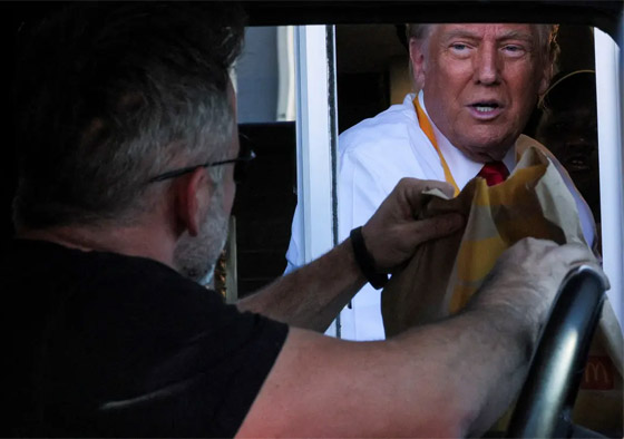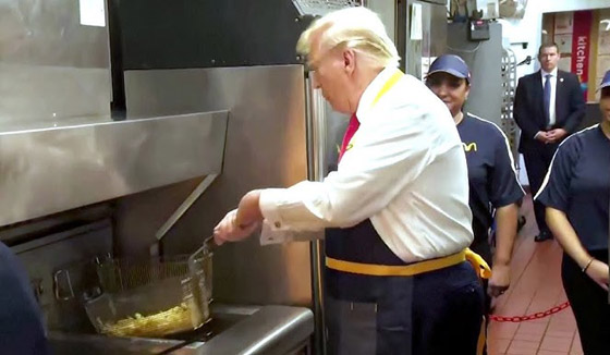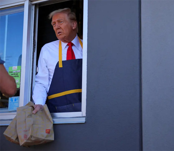 أثار الرئيس الأمريكي السابق، دونالد ترامب، تفاعلا بعد أن ذهب إلى أحد فروع مطعم "ماكدونالدز" للوجبات السريعة وقدم خدمات للزبائن. وتوقف الرئيس السابق عند أحد فروع سلسلة الوجبات السريعة في بنسلفانيا خلال جولته الأحد في ولاية كيستون، حيث استبدل سترته بزي العمل الخاص بالعاملين في المطعم.